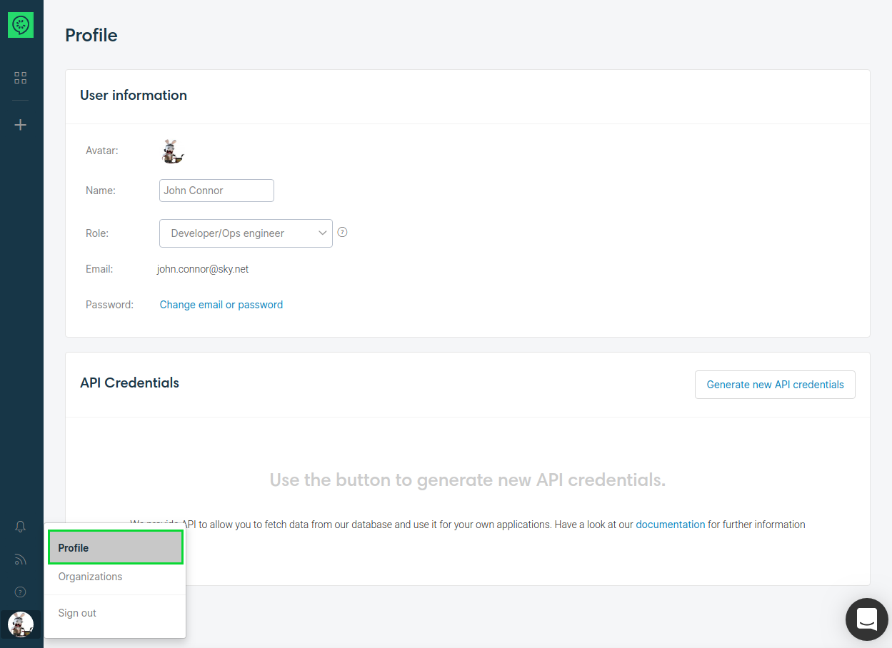 To generate or renew your API credentials use this endpoint: api/auth/sign_in.