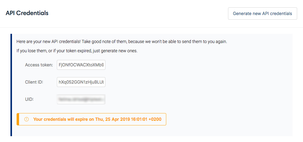 Accept: application/vnd.api+json; version=1access-token: $ACCESS_TOKEN(replace $ACCESS_TOKEN with your access token)client: $CLIENT_ID(replace $CLIENT_ID with your client ID)uid: $UID(replace $UID with your UID)